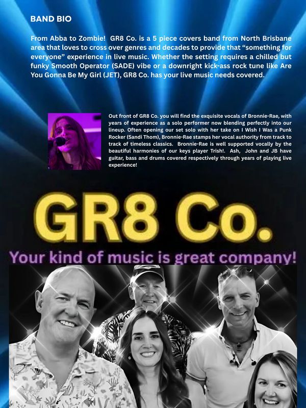 GR8 Co. was founded in 2023 as a 5 piece outfit with a pure and simple goal of entertaining a crowd with songs that are known to fill the dance floor, but with a few surprises on the set list to set the band apart from other cover bands! GR8 Co. has evolved over time to the current lineup that has rapidly become a force to be reckoned with in the cover band scene in South East Queensland. Your kind of music is great company!